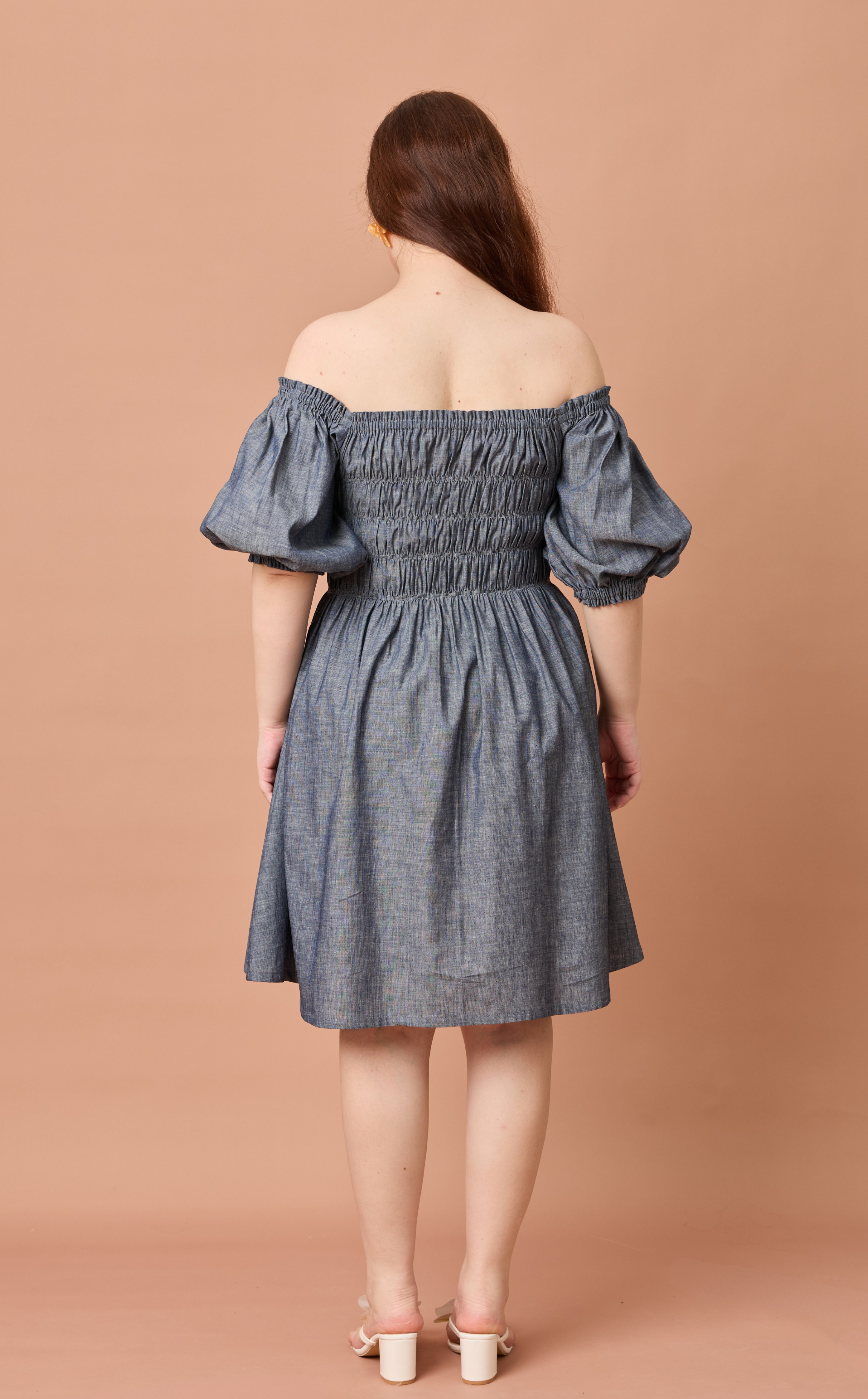 The ADORA DRESS is a statement piece featuring an off-shoulder neckline and voluminous puff sleeves for a romantic, vintage-inspired look. Its smocked bodice flatters the waist while offering a comfortable, flexible fit. This dress is perfect for garden parties, brunch dates, or any sun-filled outing.