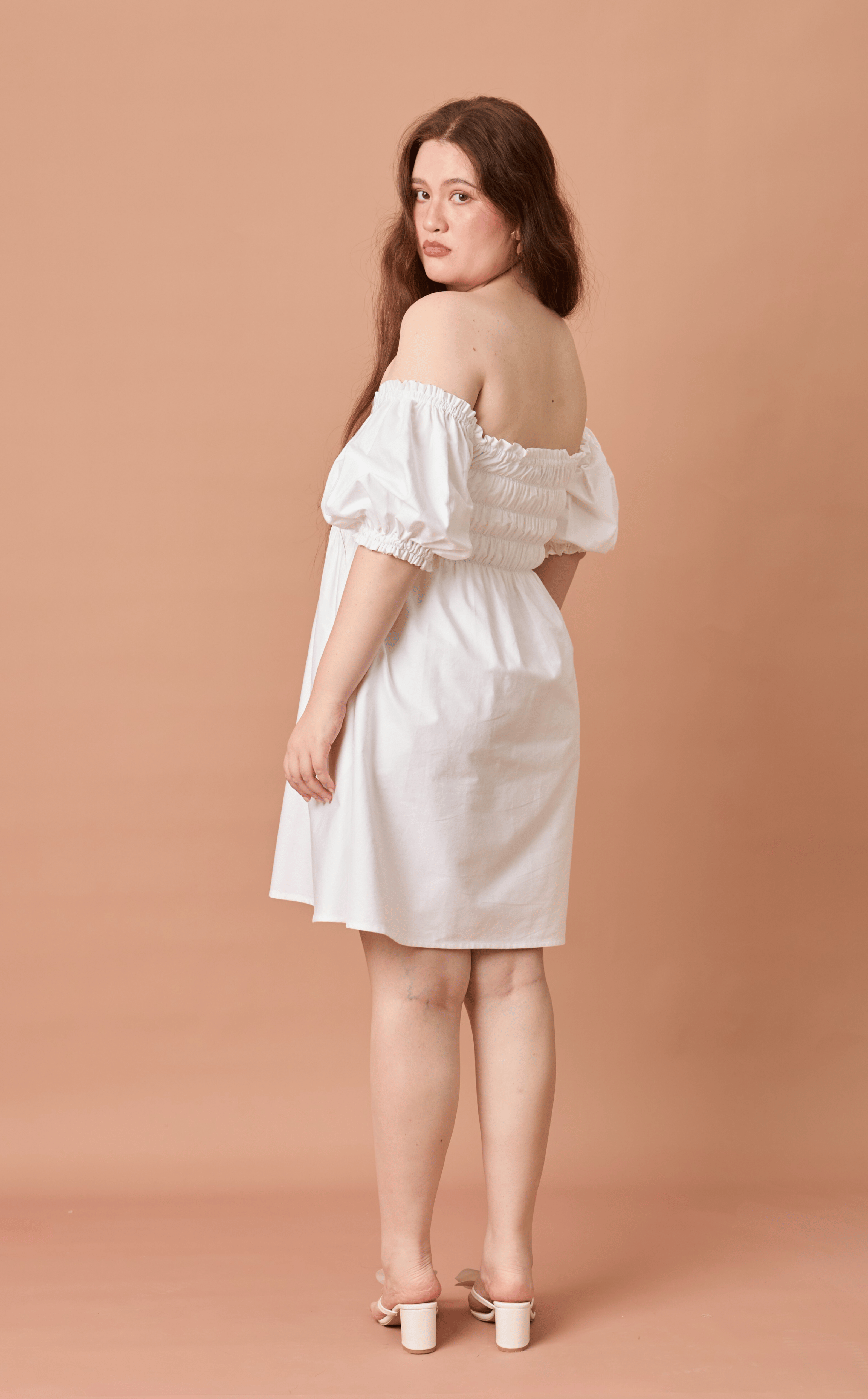 The ADORA DRESS is a statement piece featuring an off-shoulder neckline and voluminous puff sleeves for a romantic, vintage-inspired look. Its smocked bodice flatters the waist while offering a comfortable, flexible fit. This dress is perfect for garden parties, brunch dates, or any sun-filled outing.