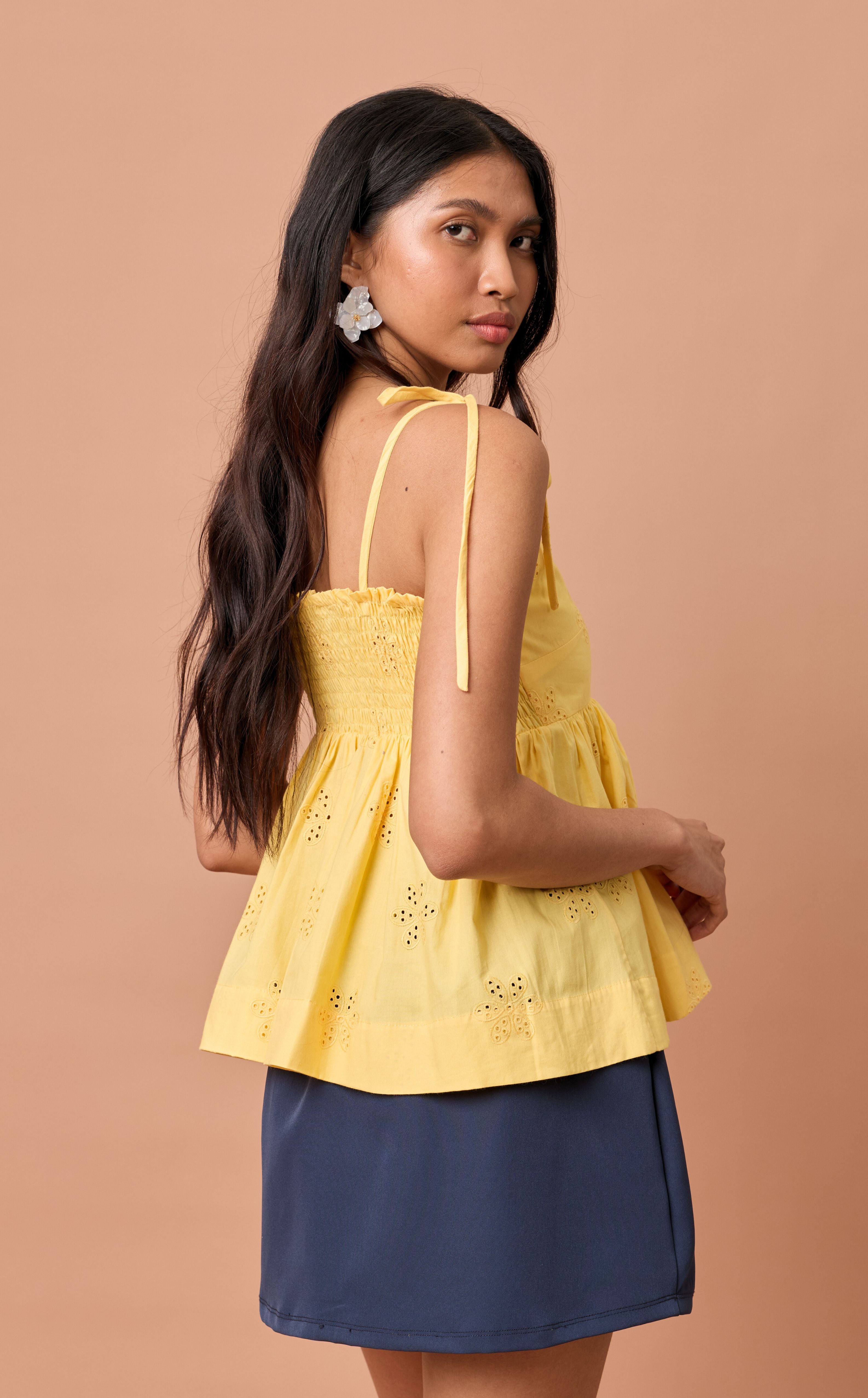 The GABRIEL TOP features a flattering smocked bodice and a flared peplum hem. Adjustable tie straps add a playful touch while ensuring the perfect fit. Breezy and feminine, it’s the ideal warm-weather staple for effortless day-to-night styling.