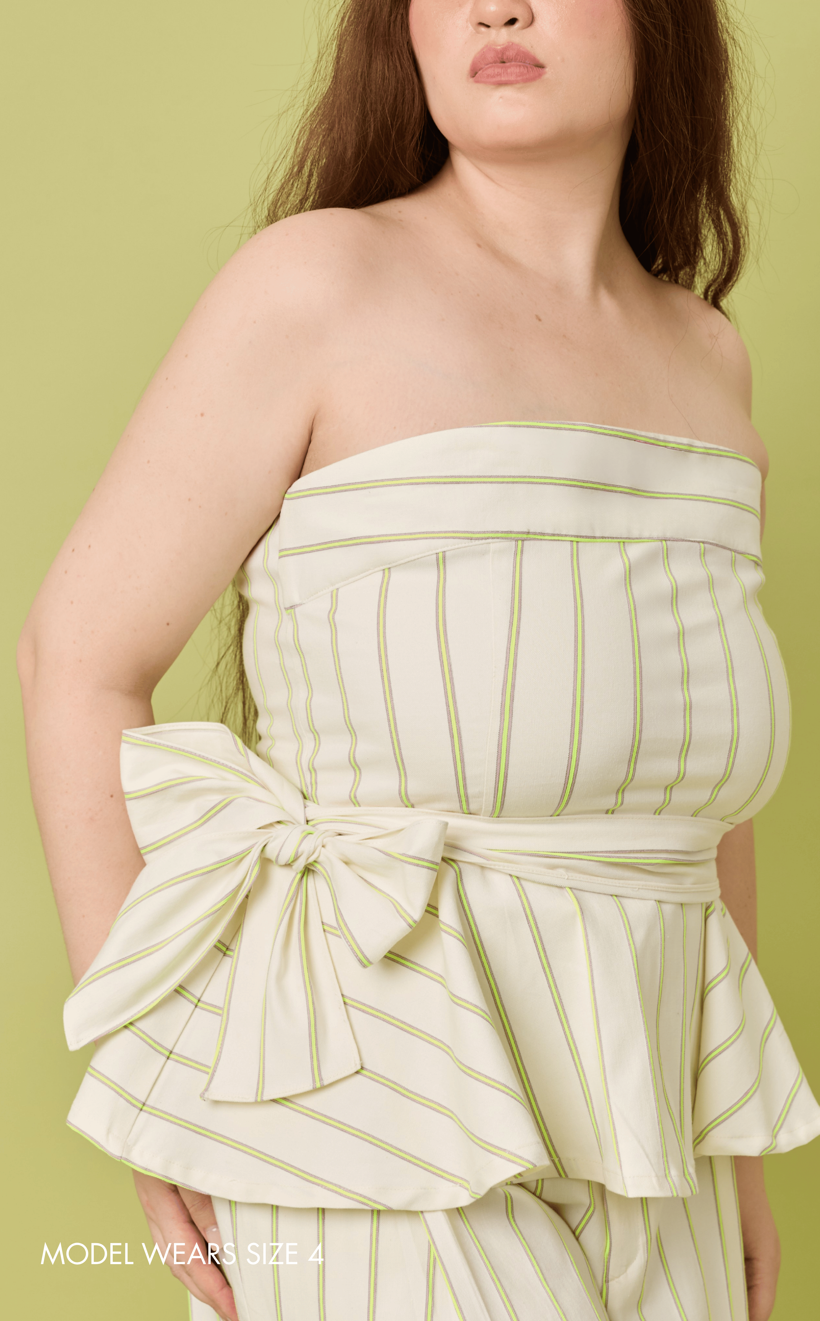 The PLUMA TOP is a strapless, figure-flattering piece featuring a dramatic side-tie detail and peplum hem for a bold yet feminine silhouette. Perfect for day-to-night styling, this top adds instant sophistication to any outfit.
